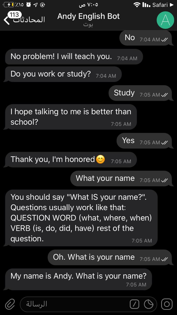 وايضاً هناك بوت تعليمي للغة الانجليزي ويتحدث معك ويسولف معك ويقوم بتعليمك ذلك