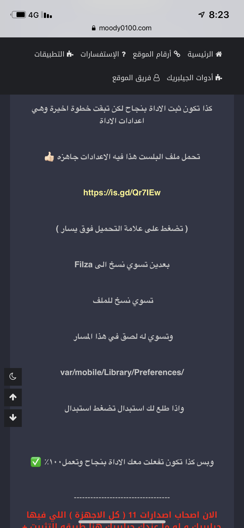 لازم في البداية تكون عندك اداة filza وبعدين تحمل ملف البلست من الرابط بعدين تسوي للملف نسخ من الخيارات الي تحت وبعدين تلقى سهم فوق ارجع لين ما تطلع لك كلمة var وبعدين اصغط على كلمة موبايل في نفس الملف حق ال var وبعد كذا library