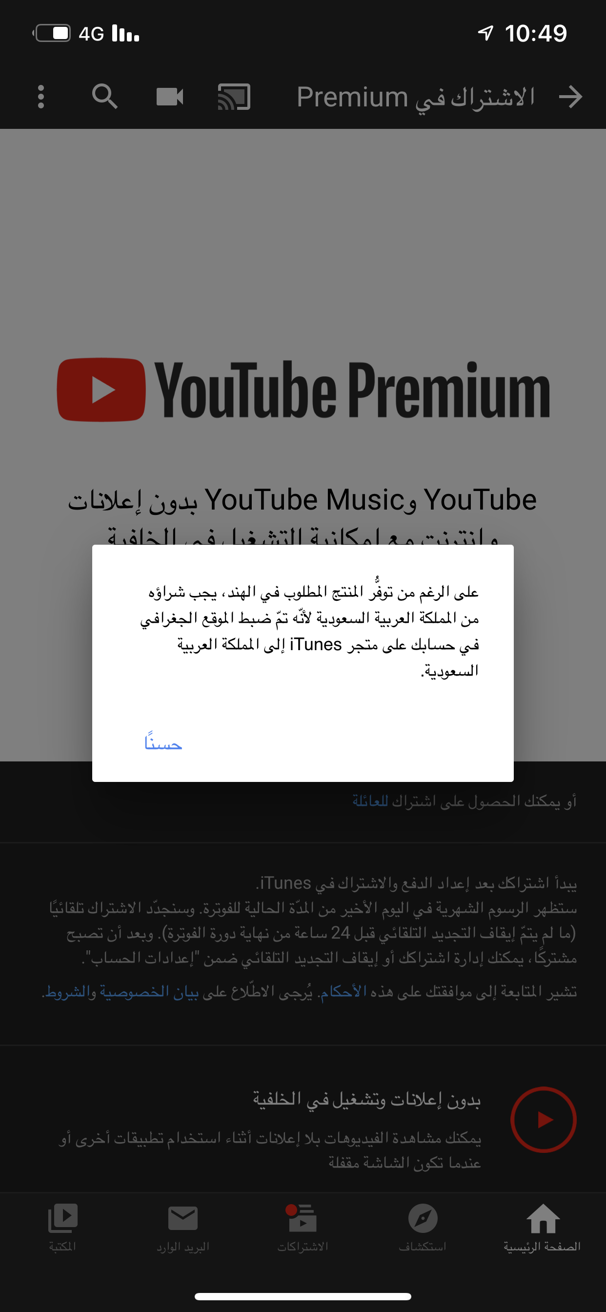 36005 اتبعت الخطوات للاشتراك بـاليوتيوب بريميوم لكن عندما فتحت الرابط ظهرت لدي العمله بالروبيه لكنه رفظ استكمال الاشتراك لانه تم تحديد موقعي بالسعودية عن طريق itunes موضح بالصوره. هل يوجد حل او طريقه ؟
