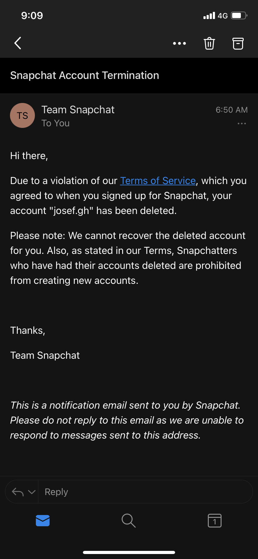 والتي وافقت عليها عند التسجيل في Snapchat تم حذف الحساب "josef.gh"
