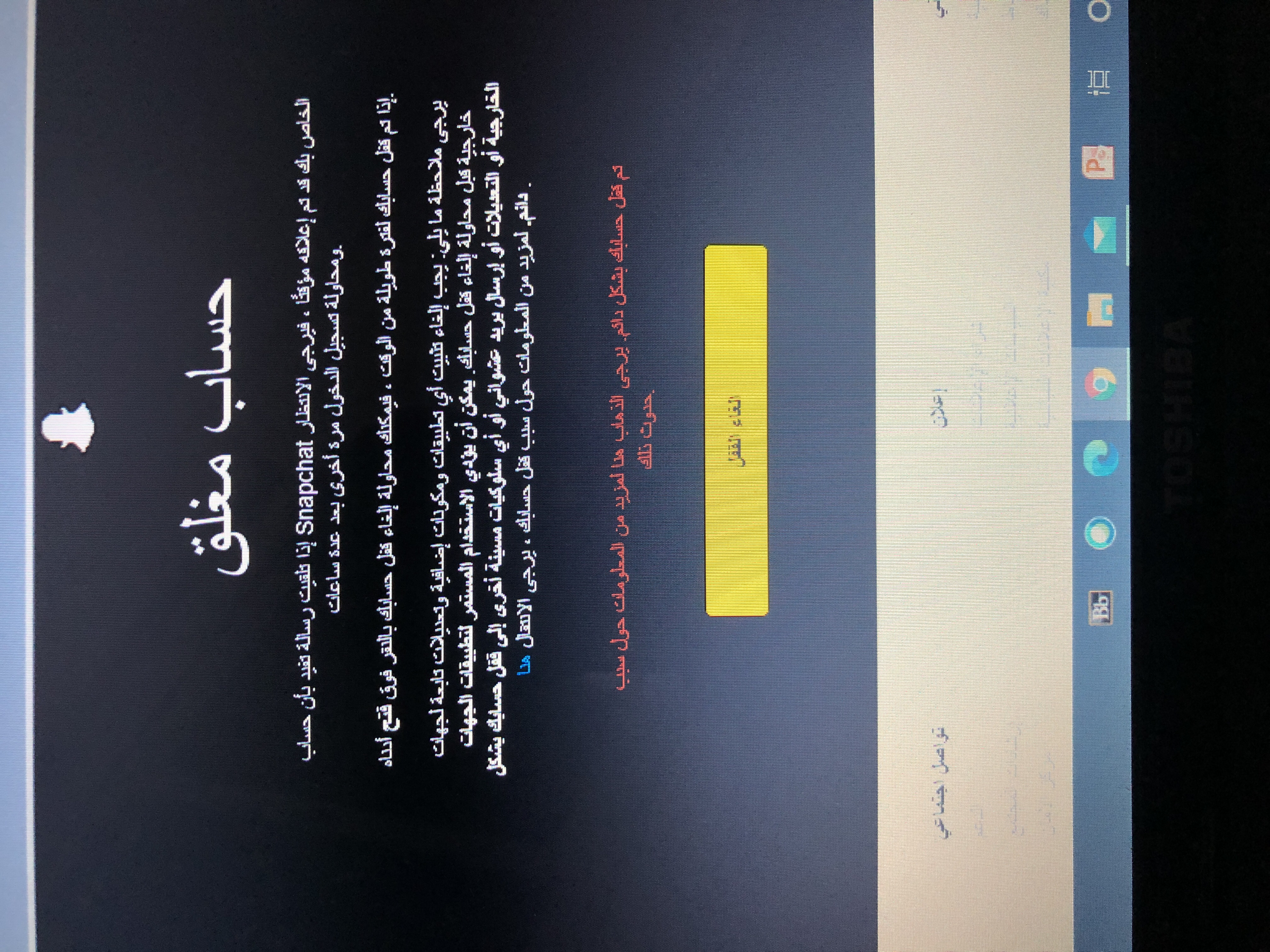 41054 مساء الخير ، عندي مشكله بالسناب مايدخل من جوالي يطلع اوه لقد تم اغلاق حسابك بشكل مؤقت مدري عشان كنت اشغل vpn او ابدل بين حساباتي واذا بدخل من جوال ثاني انتظر 24 ساعه عشان يفتح ورحت بسوي الغاء قفل يقول تم قفل حسابك بشكل دائم واذا ضغطت ع هنا ماتفتح معي الصفحه وش الحل وشكراً