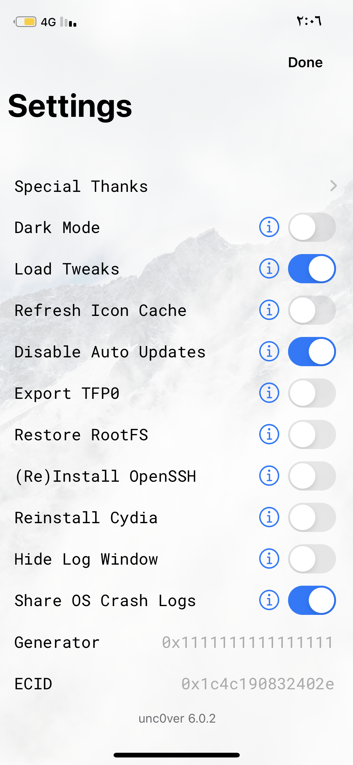 الإستفسارات 42768 طفى الجهاز وبعدها تم تحميل الانكفر من 3uTools وبعدها اختفت السورسات . نوع الجهاز: ايفون 8 بلس اصدار الجهاز: 13.5 هل الجهاز يحتوي على جيلبريك؟: نعم الجواب: مرحبا اذا كنت بي تفعل الجلبريك عن طريق انكفر حط نفس الاعدادات اللي في انكفر نفس كذا صورة توضيحية للجواب: تمت الإجابة منذ 5 سنوات 0 0