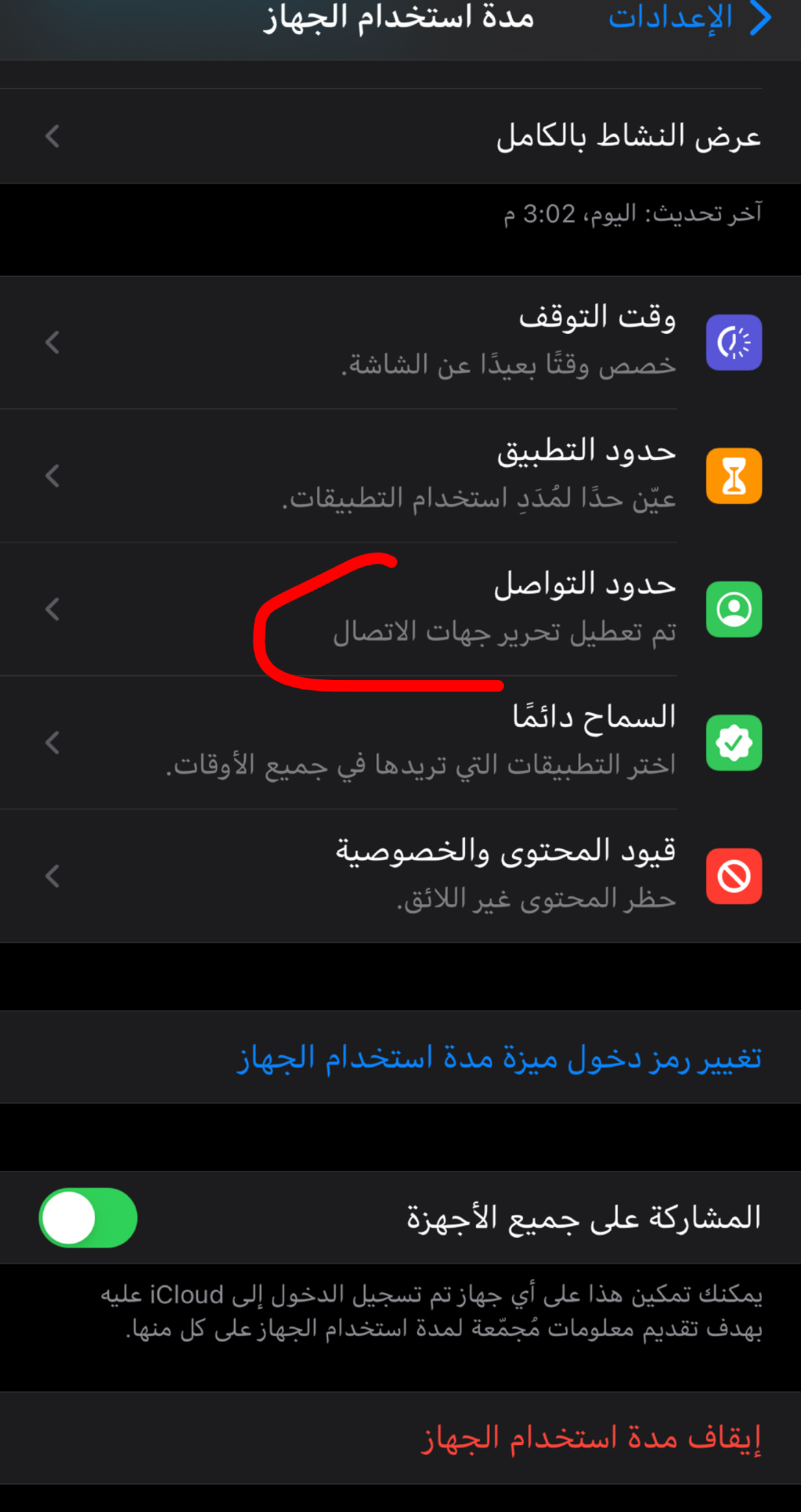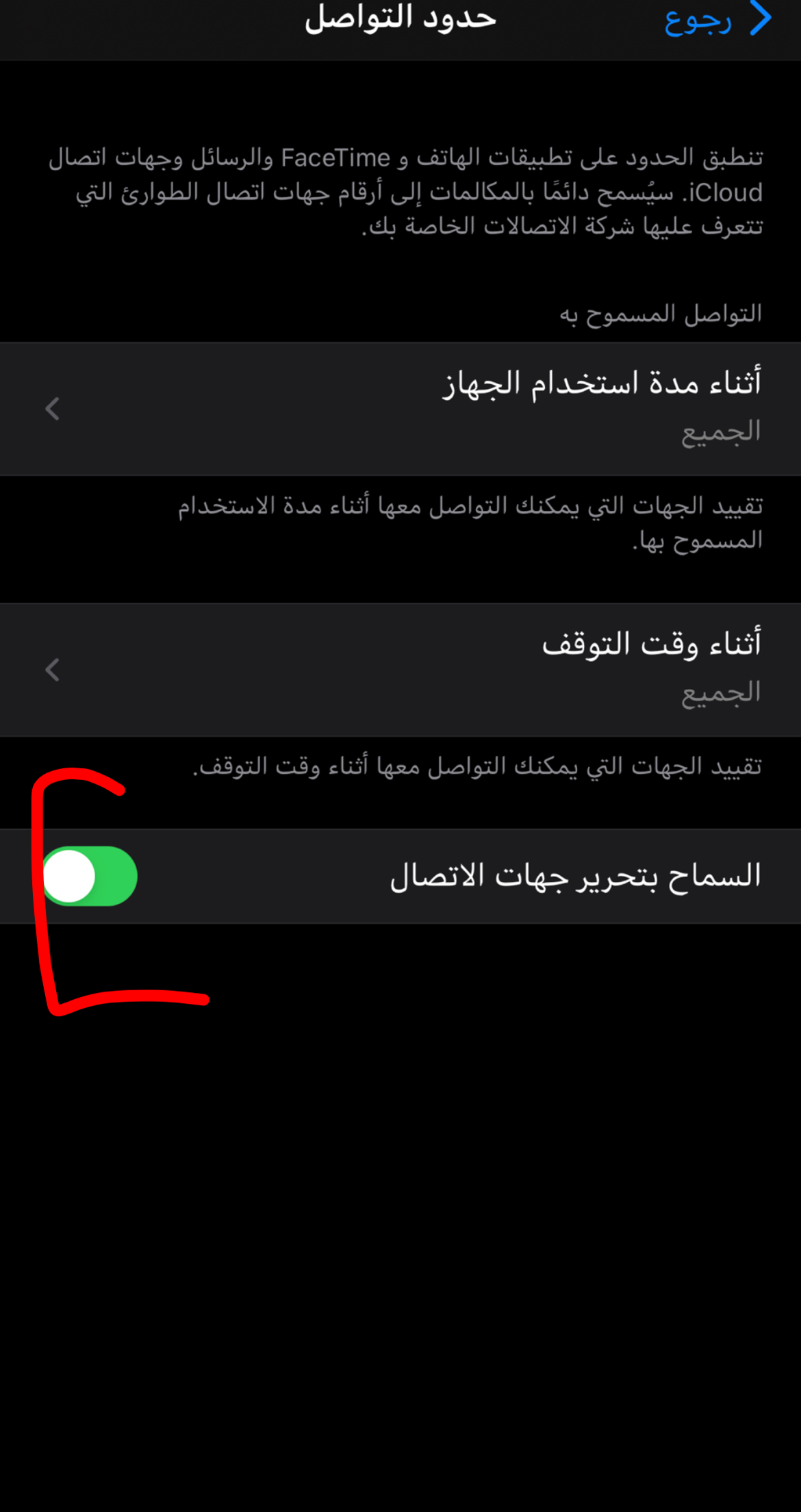 ذا يعني ما تقدر تعدل على جهات الاتصال وتقدر تتحكم بلخيار ذا من مدة استخدام الجهاز >حدود التواصل .يوجد خيار في الاسفل "السماح بتحرير جهات الاتصال" فعل الخيار وبتروح علامة القفل وتقدر تعدل على جهات الاتصال