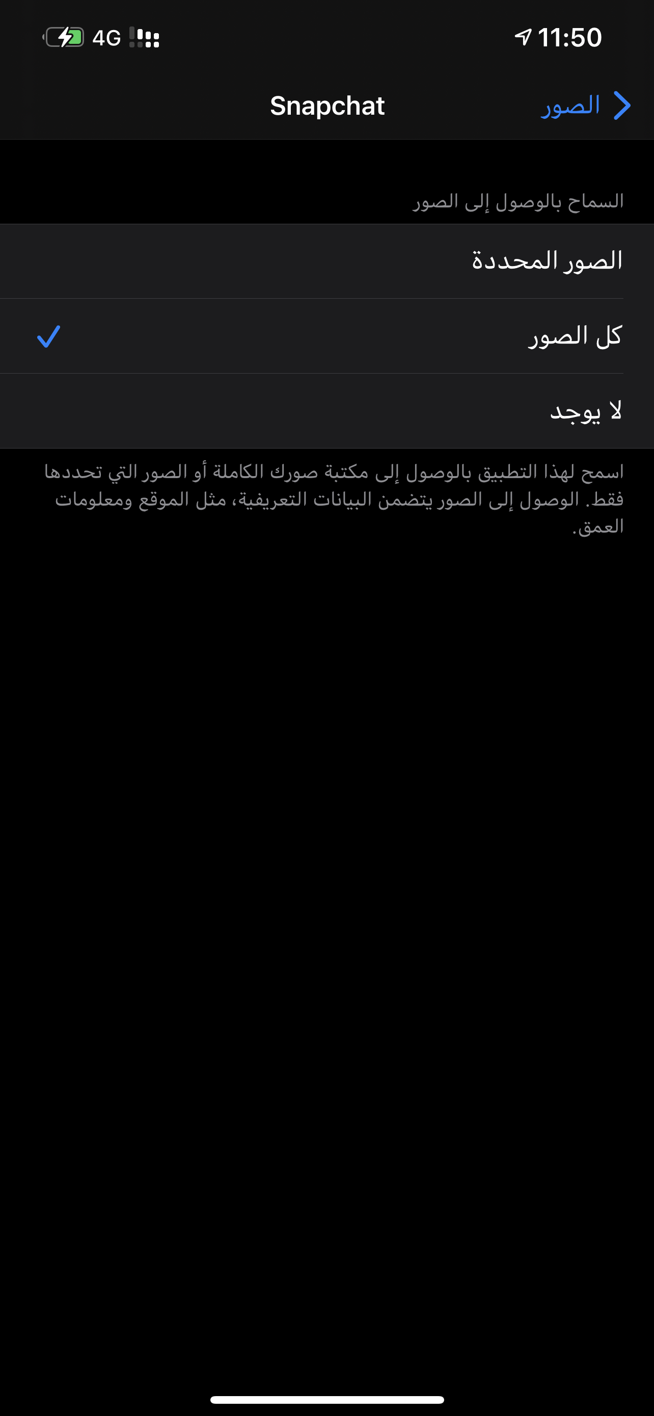 الاعدادات> الخصوصية>الصور>اختر السناب وتاكد انك محدد خيار كل الصور