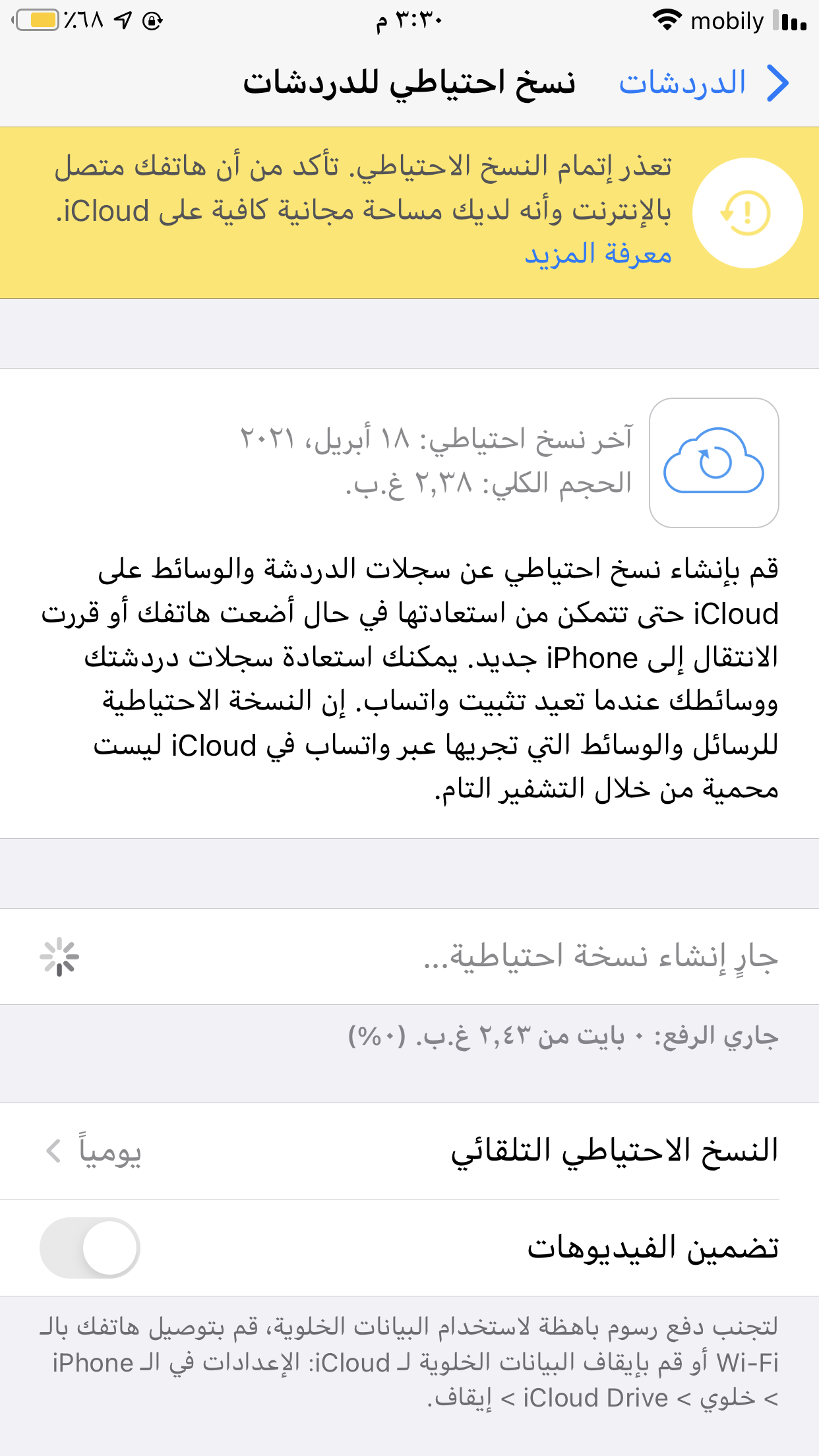 الاعدادات -اعاده تعين-اعاده تعين اعدادات الشبكه سجل خروج من ايكلاود وجرب ادخل ثانيه وسو نسخه لدردشات وان شاء الله يضبط