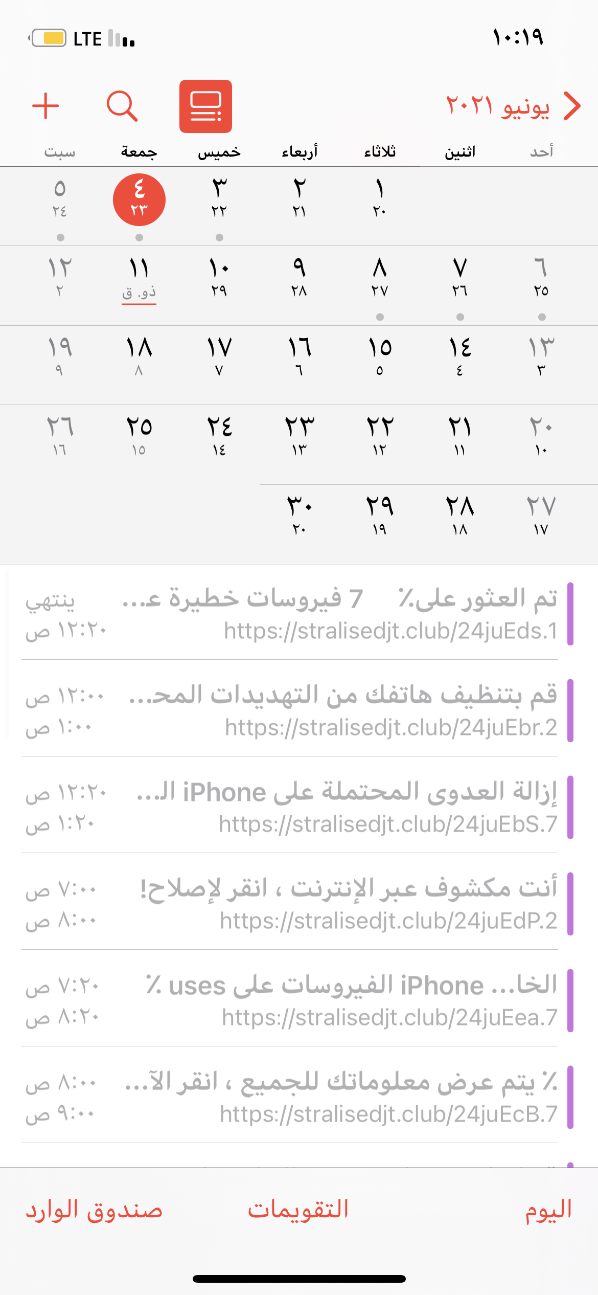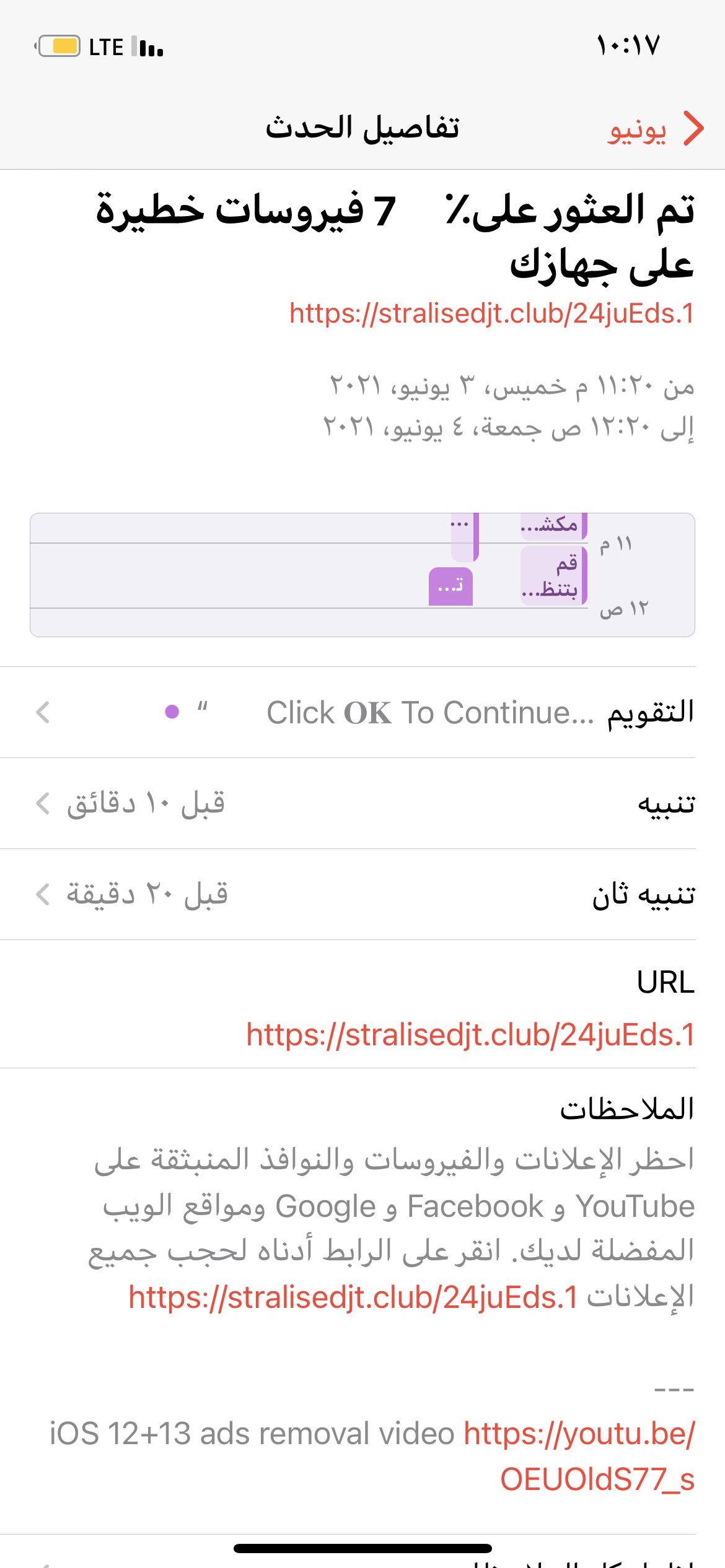 الإستفسارات 45076 اخواني الله يعافيكم انا يظهر عندي اشعارات في التقويم بأن( تم العثور على فيروسات خطيره يرجى تنظيف الجوال بالضغط على الرابط......الخ) موضح أدناه الاشعارات اللي تظهر لي،،ايش المشكله بالضبط? نوع الجهاز: ايفون 12 pro اصدار الجهاز: 14.4.2 هل الجهاز يحتوي على جيلبريك؟: لا صورة توضيحية للسؤال: الجواب: تفضل الشرح مرفق بالصوره صورة توضيحية للجواب: تمت الإجابة منذ 5 سنوات 0 0
