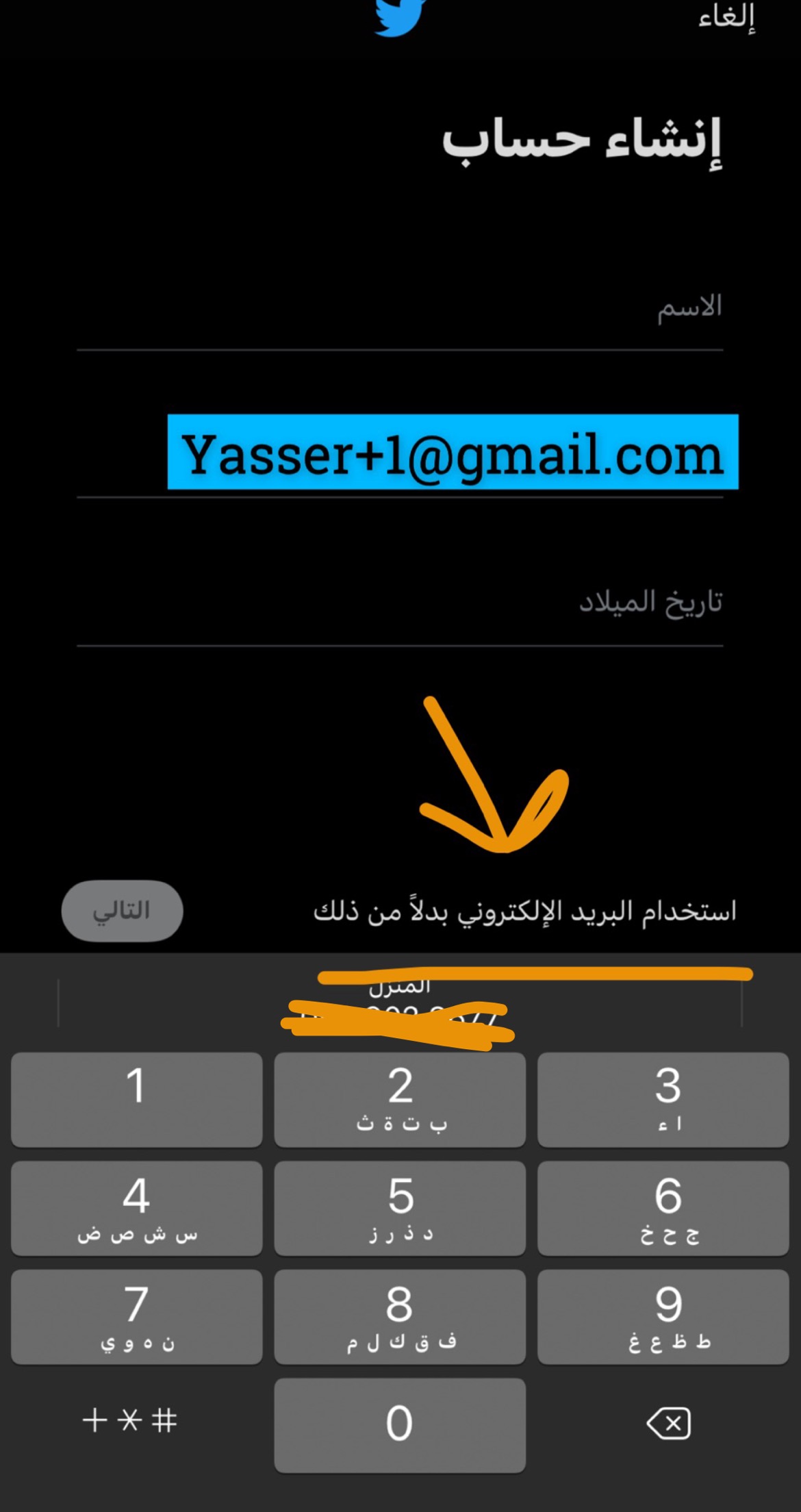 اذا طلب منك تويتر اميل او رقم جوال انت اختار اميل واكتب اميلك وراح يكون بهذه الطريقه
