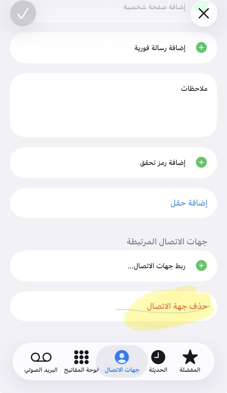 الدخول ع جهة الاتصال ثم تعديل ثم النزول الي اخر شي وبتحصل حذف جهة الاتصال
