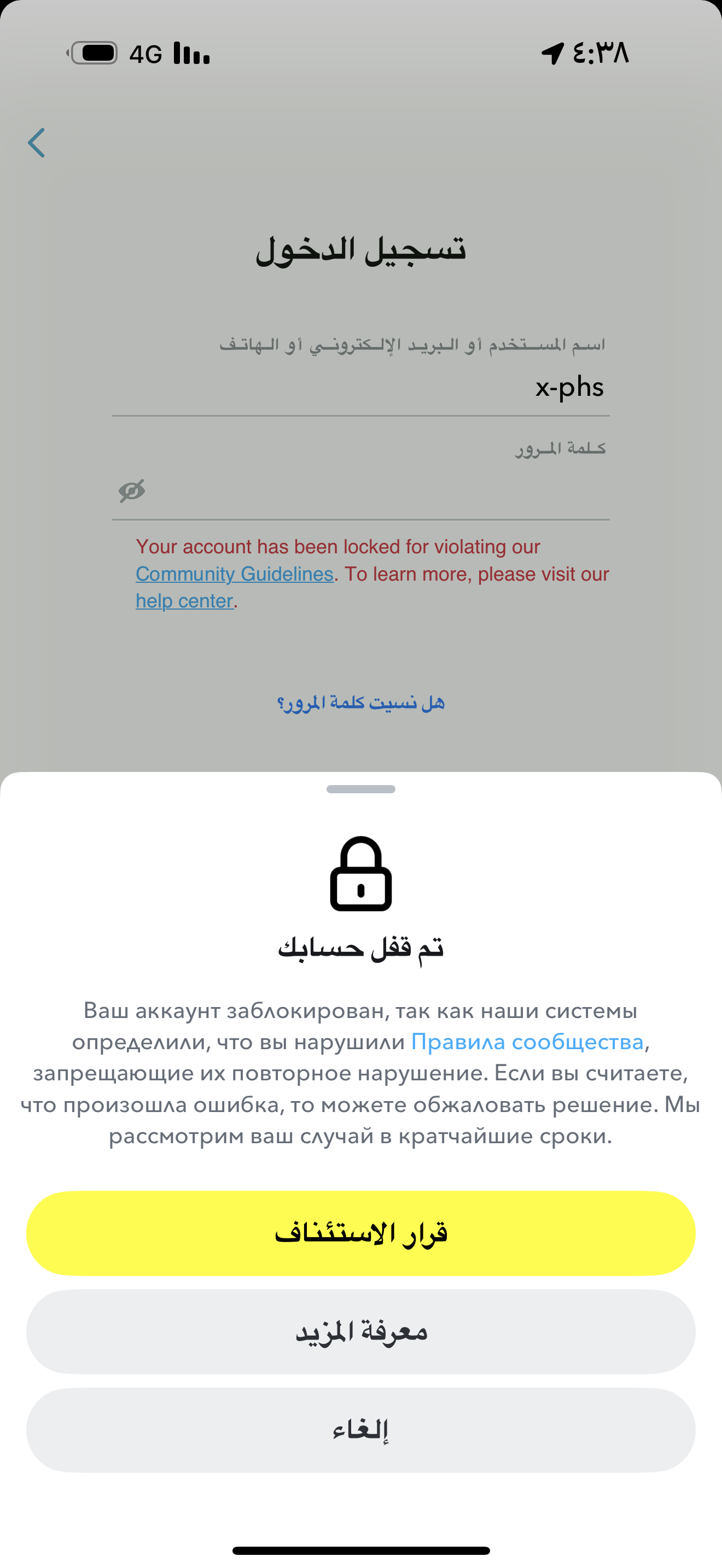 الطريقة الشرعية الوحيدة لاستعادة حسابك المقفل هي عبر عملية الاستئناف (الطعن) داخل تطبيق سناب شات نفسه.